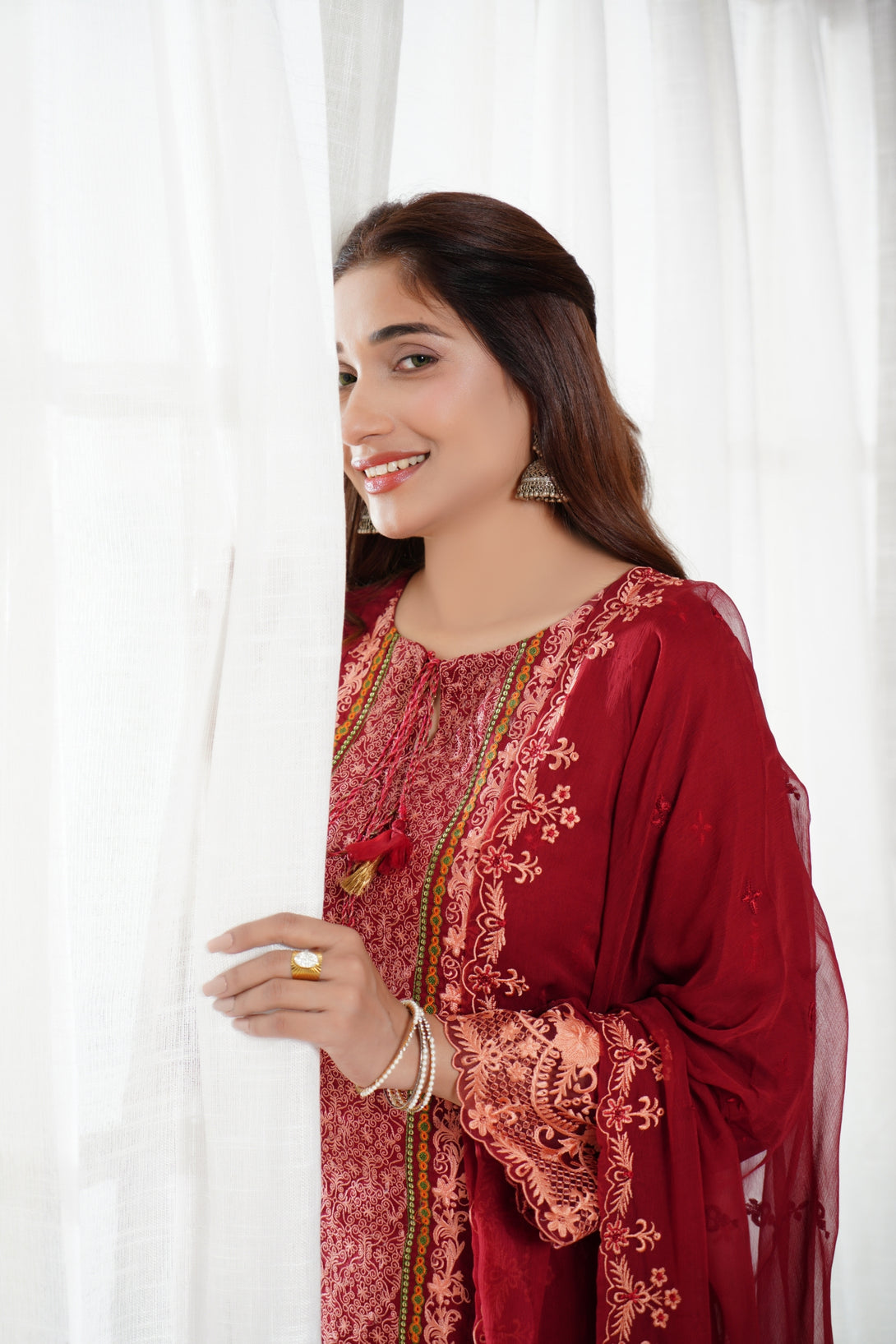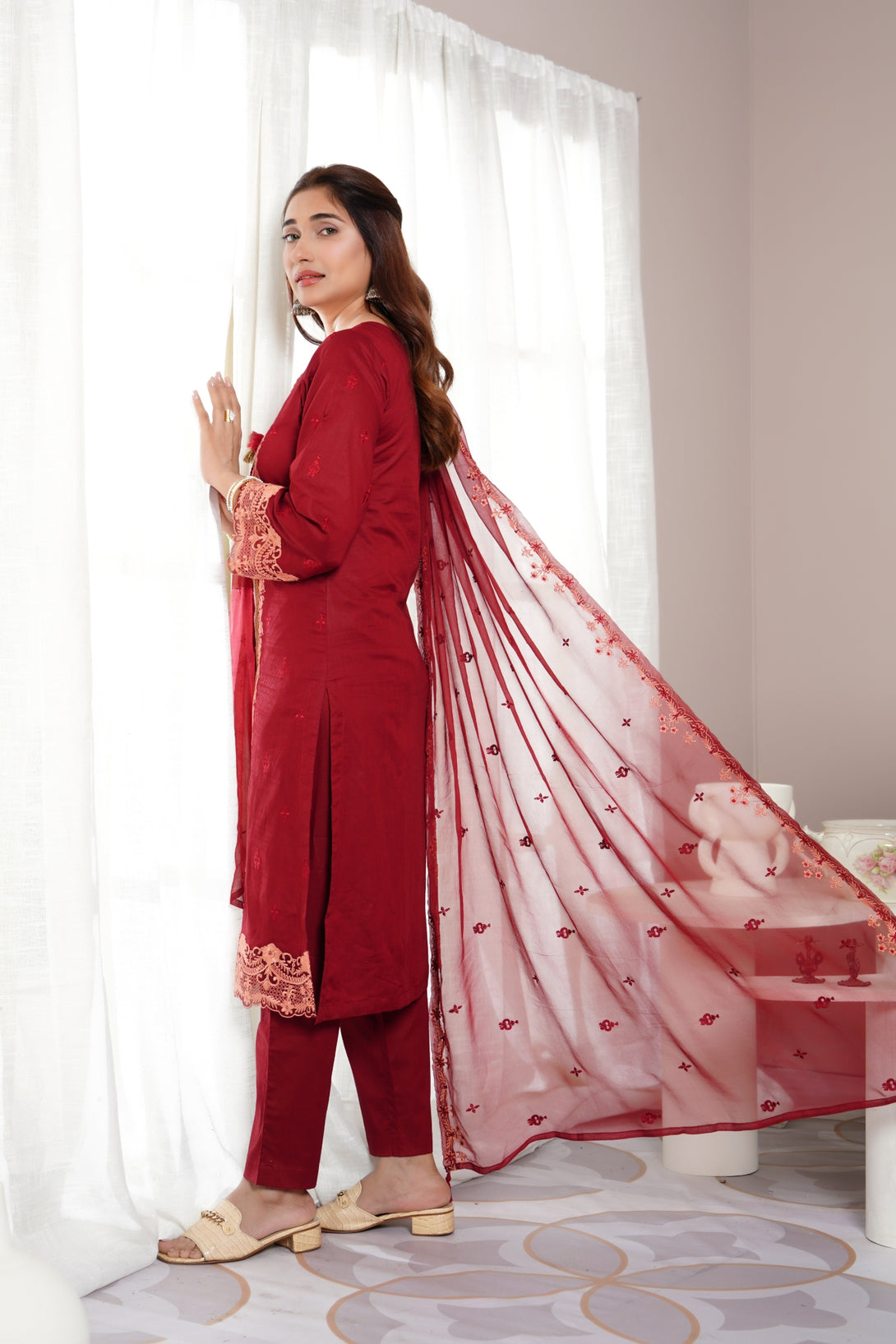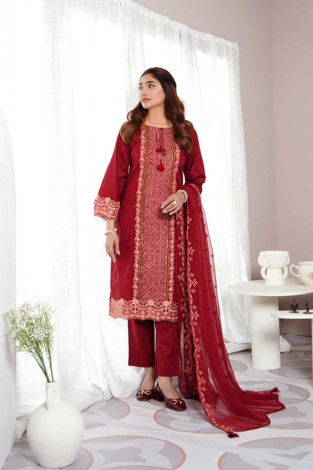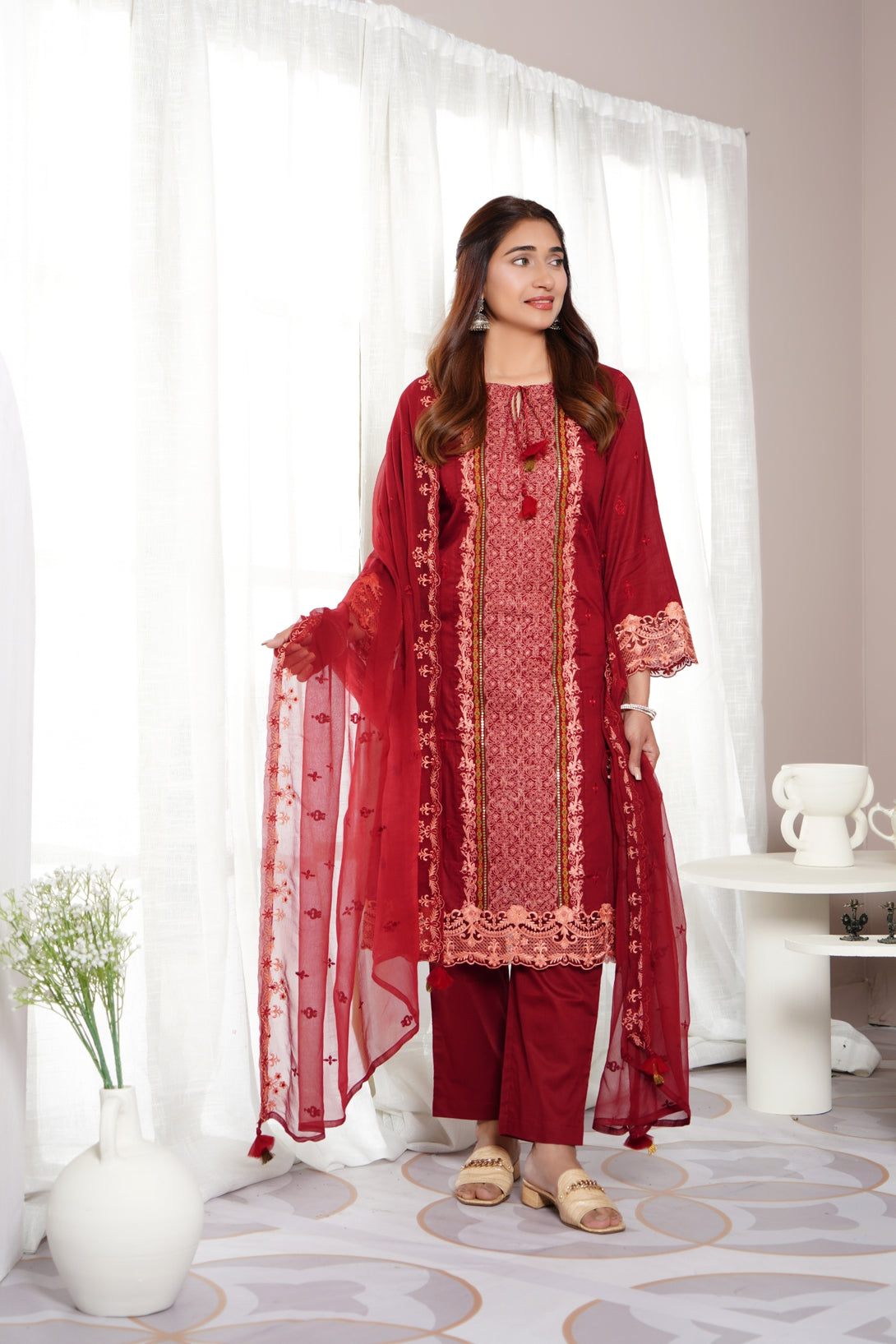 3Pcs 100% cotton with full embroidery luxury Pret with chiffon dupatta,