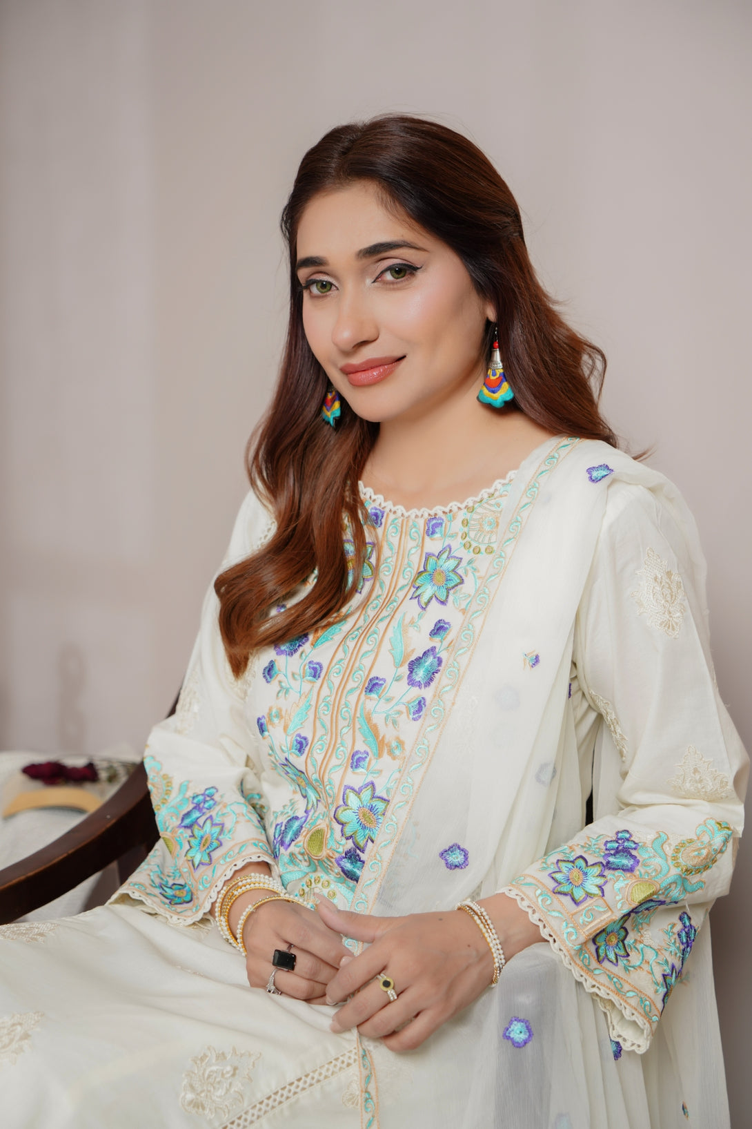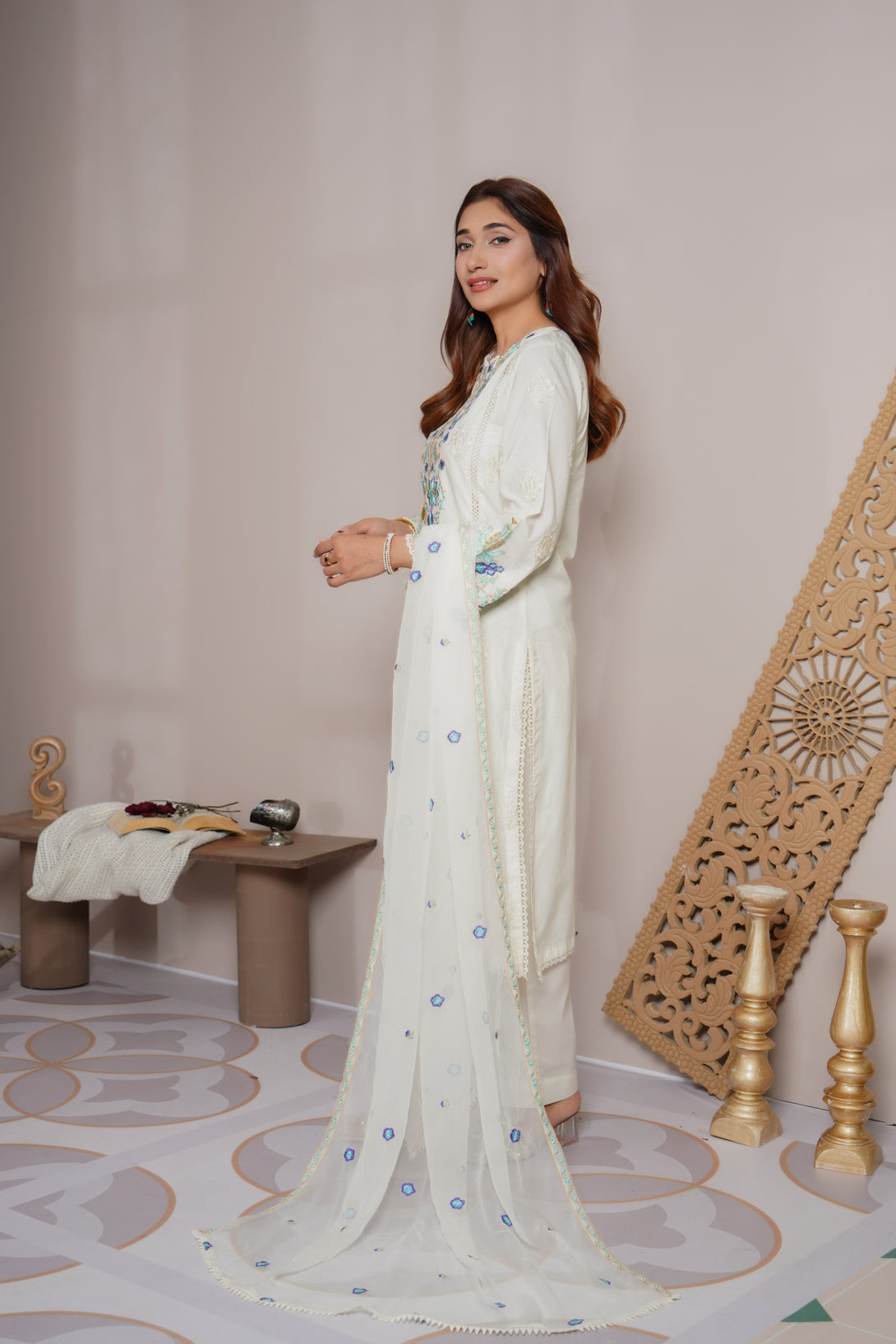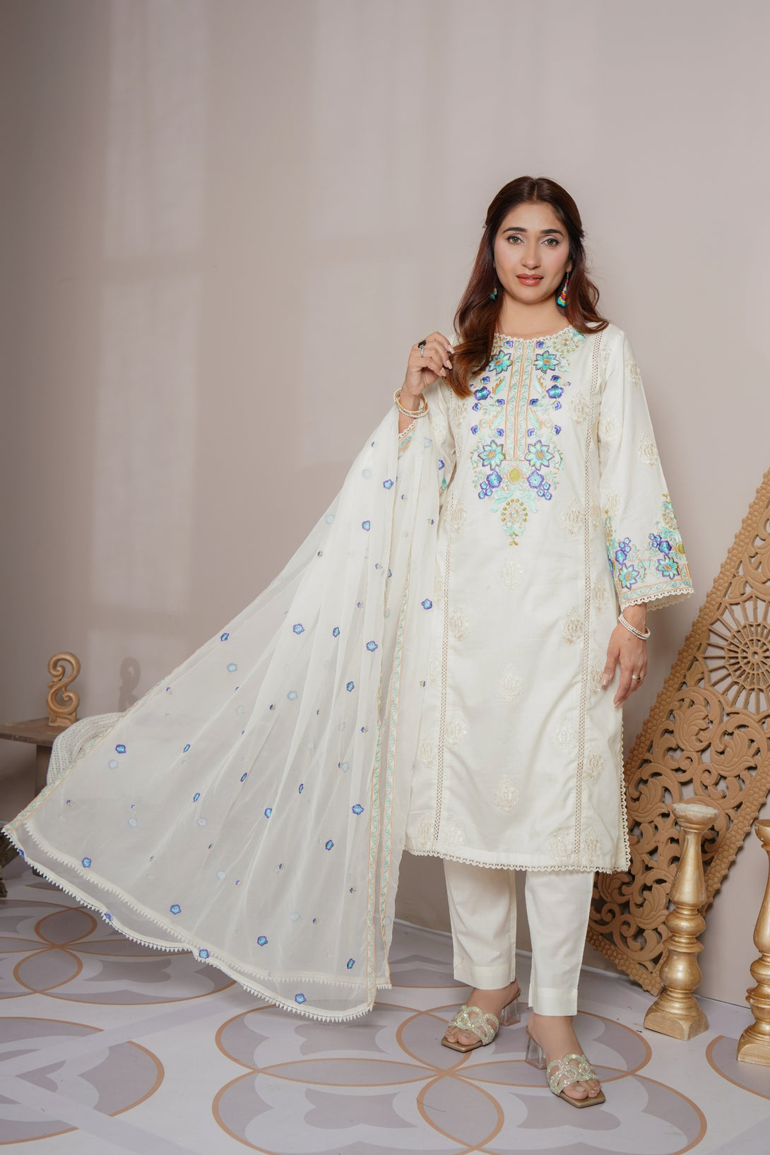 3Pcs 100% cotton with full embroidery luxury Pret with chiffon dupatta,