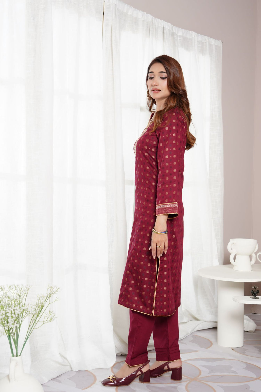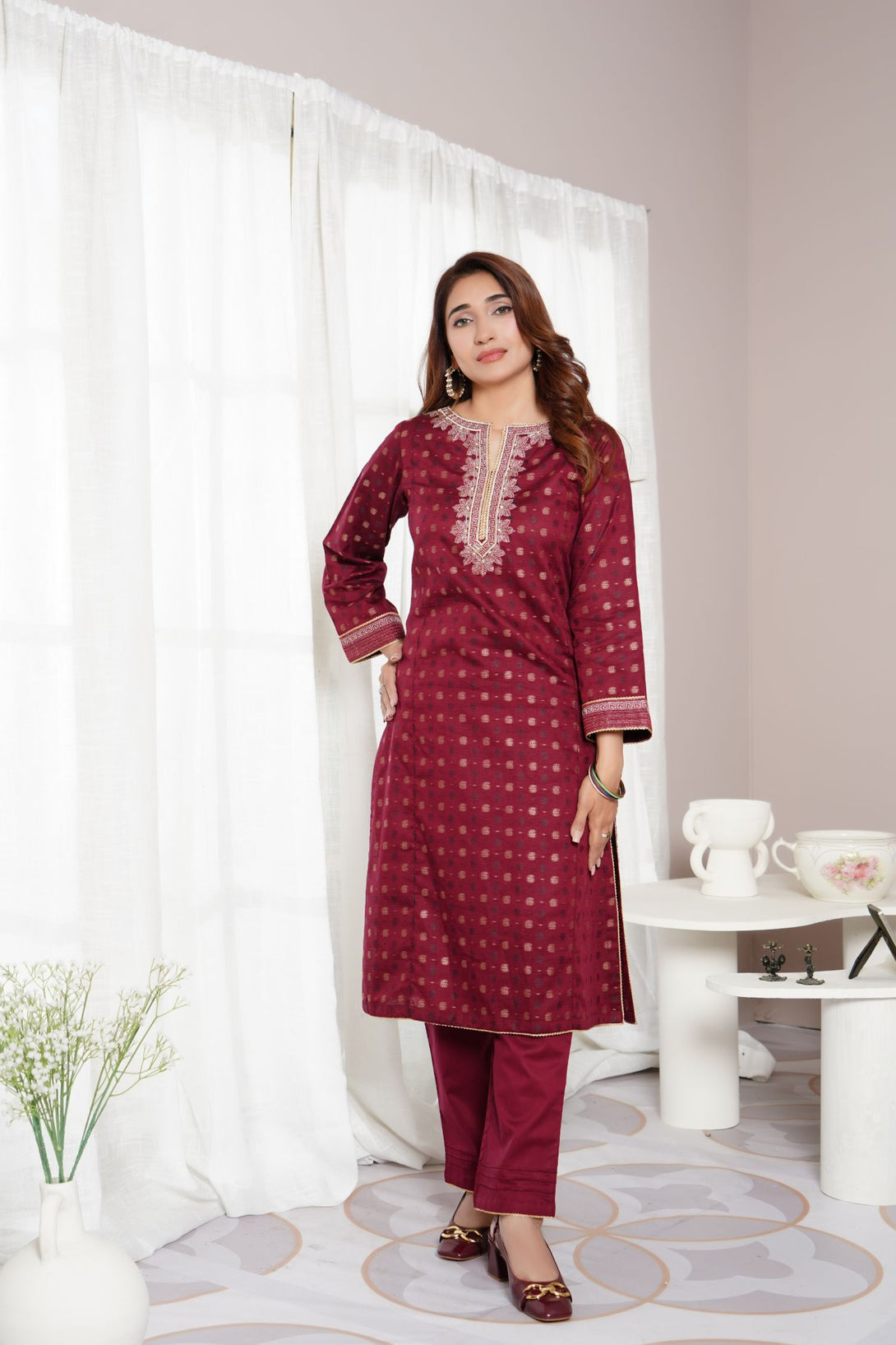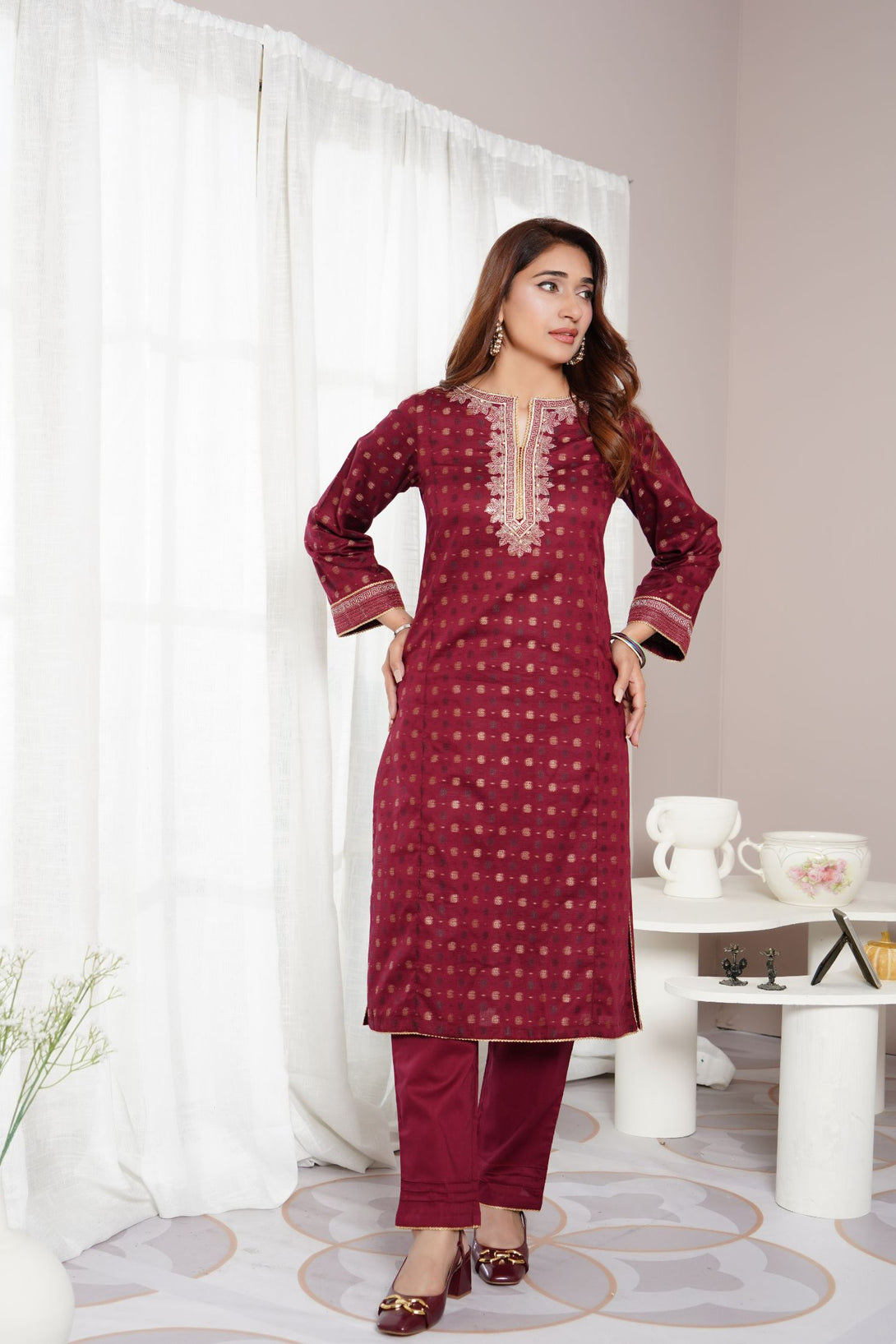Self-Jacquard brochia embroidered RTW stitched 2pcs suit,