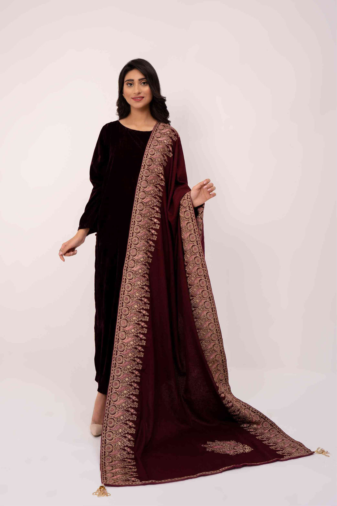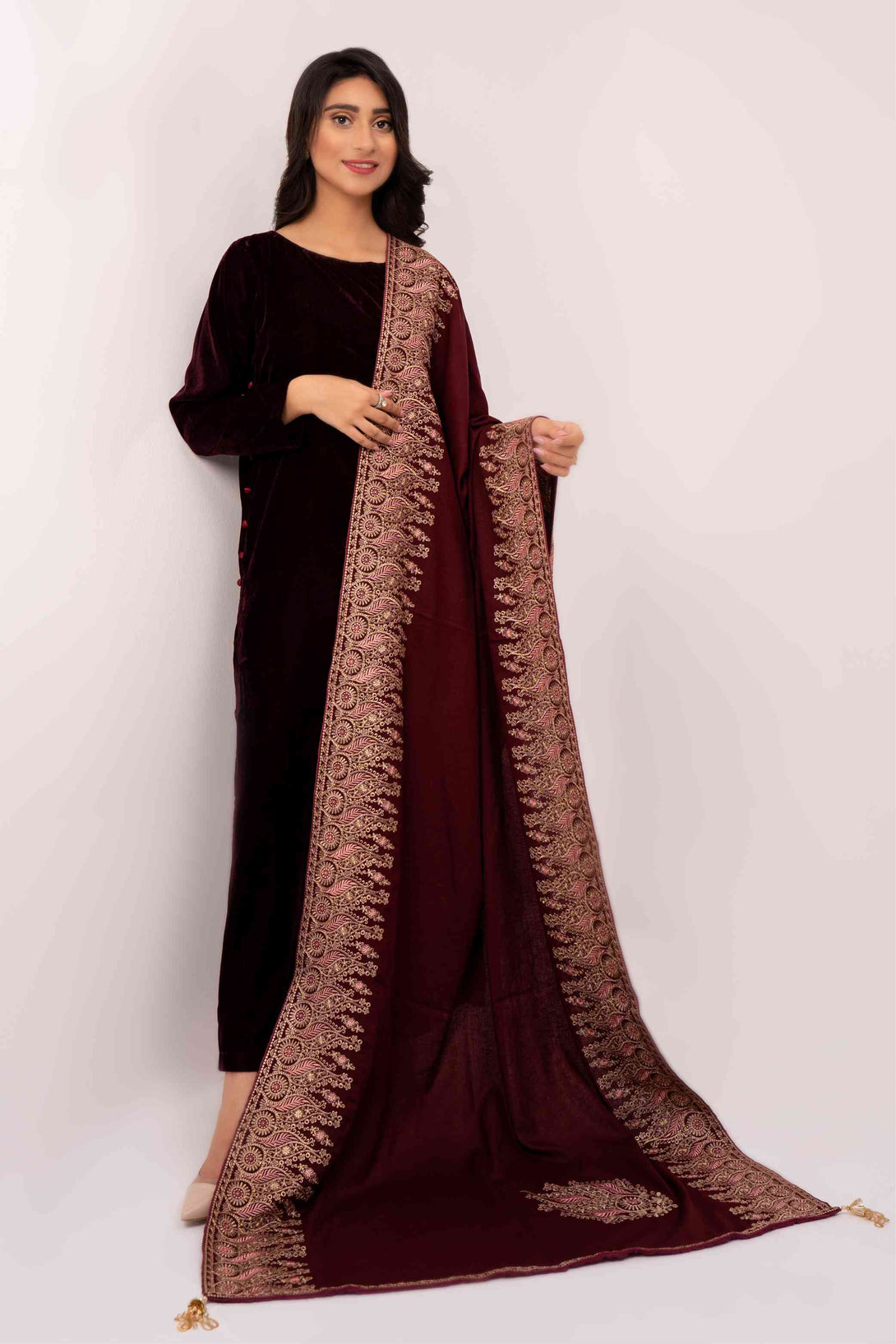 Motif Maroon Embroidered Karandi Shawl. SHK-646 MOTIF MAROON